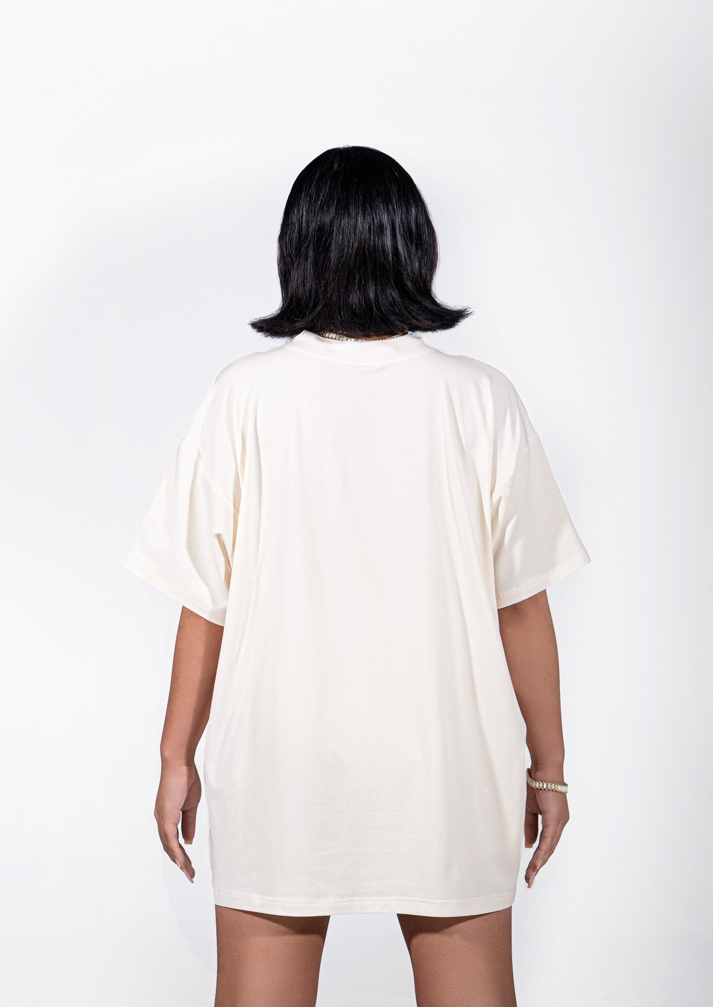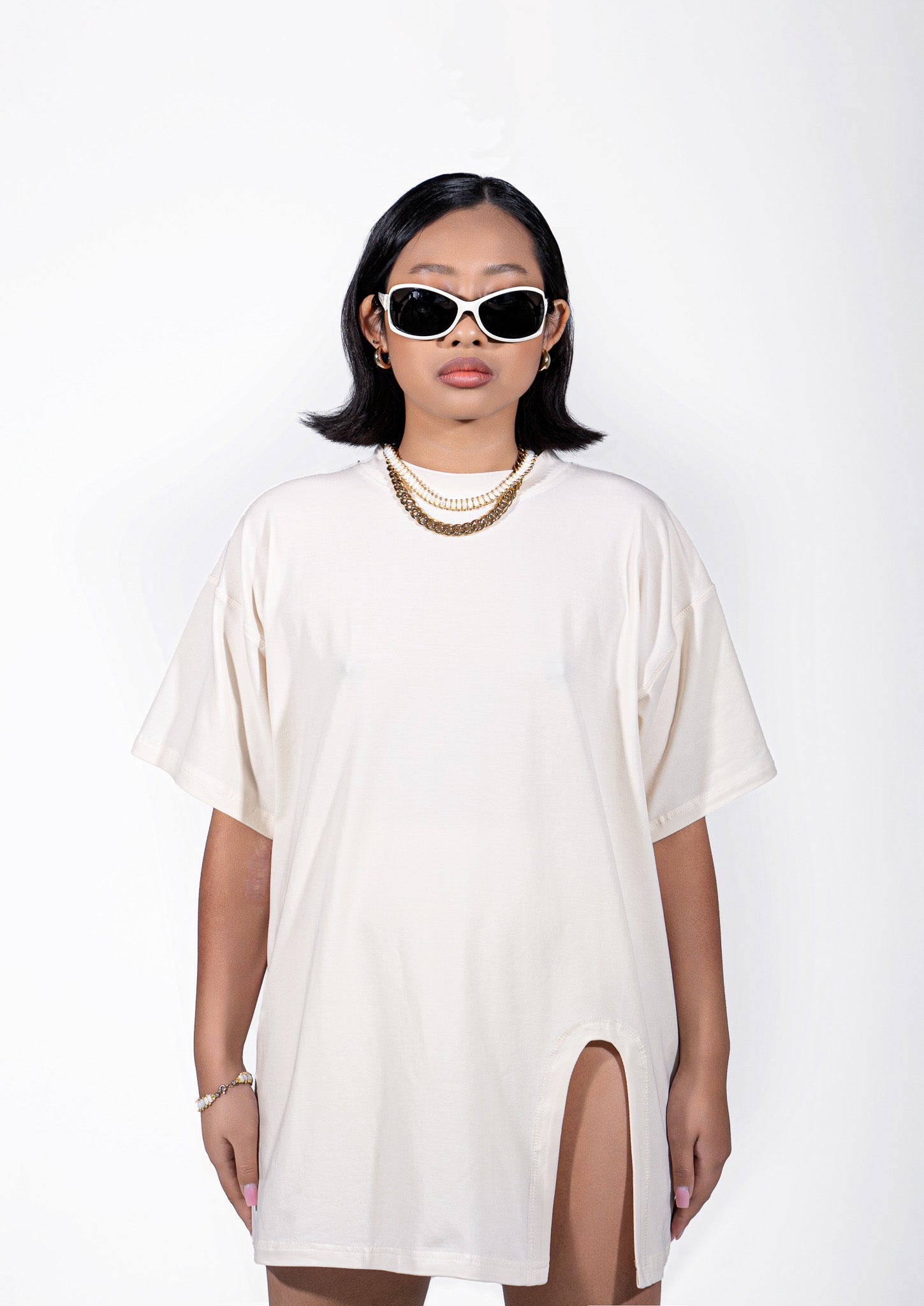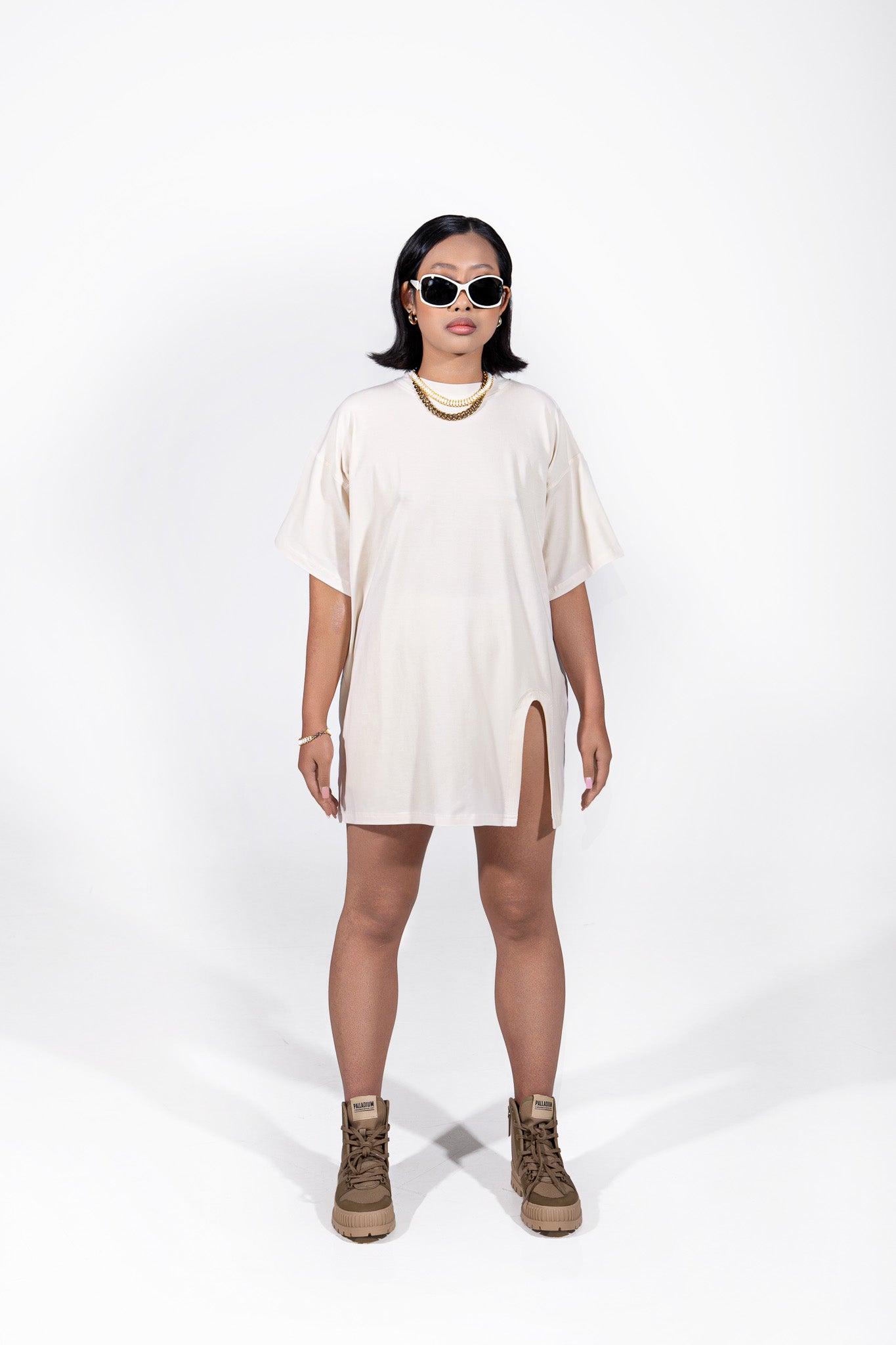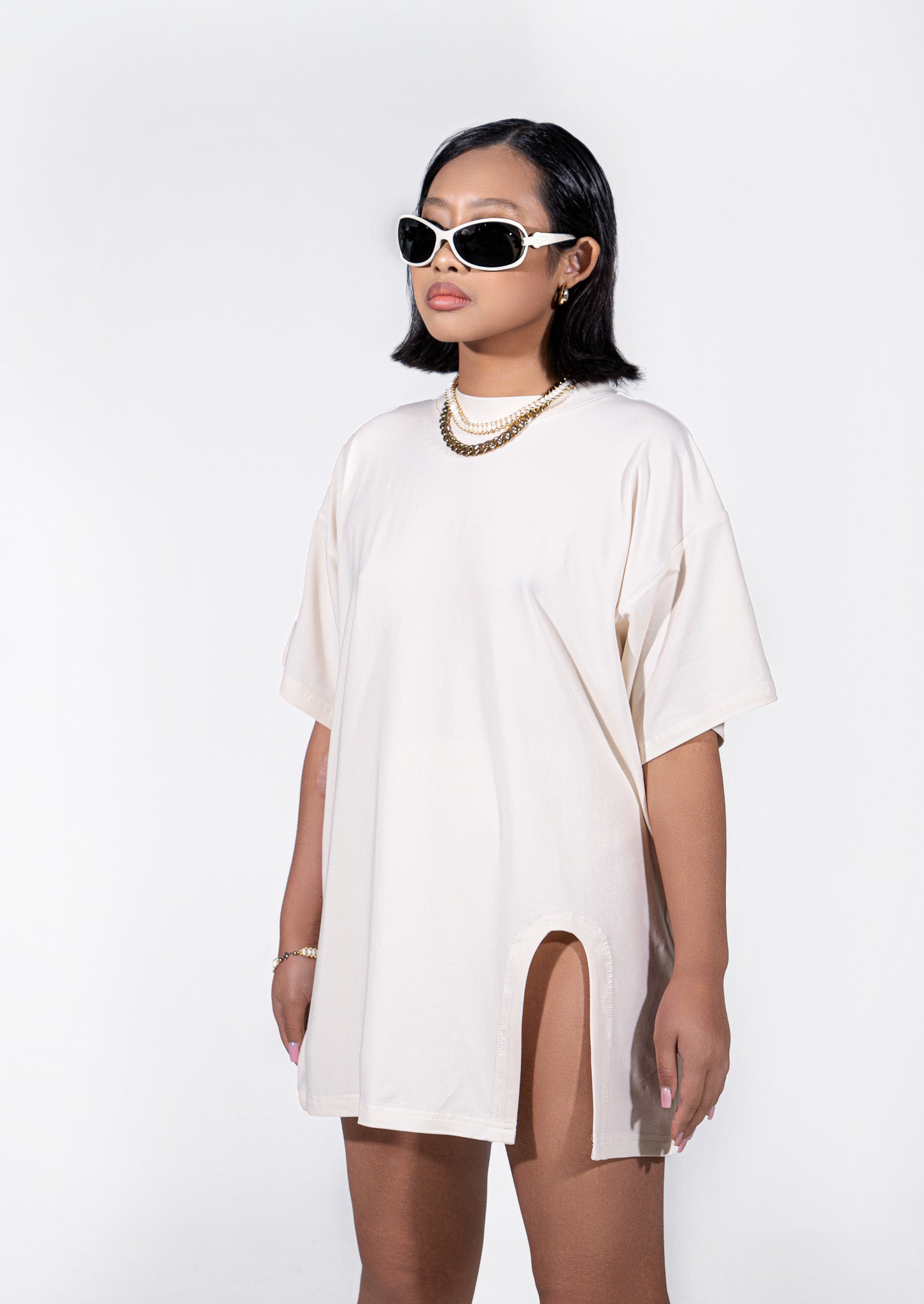 [POLARO] Oversized Cut Out Tee Dress & One Leg Short in Oat Latte